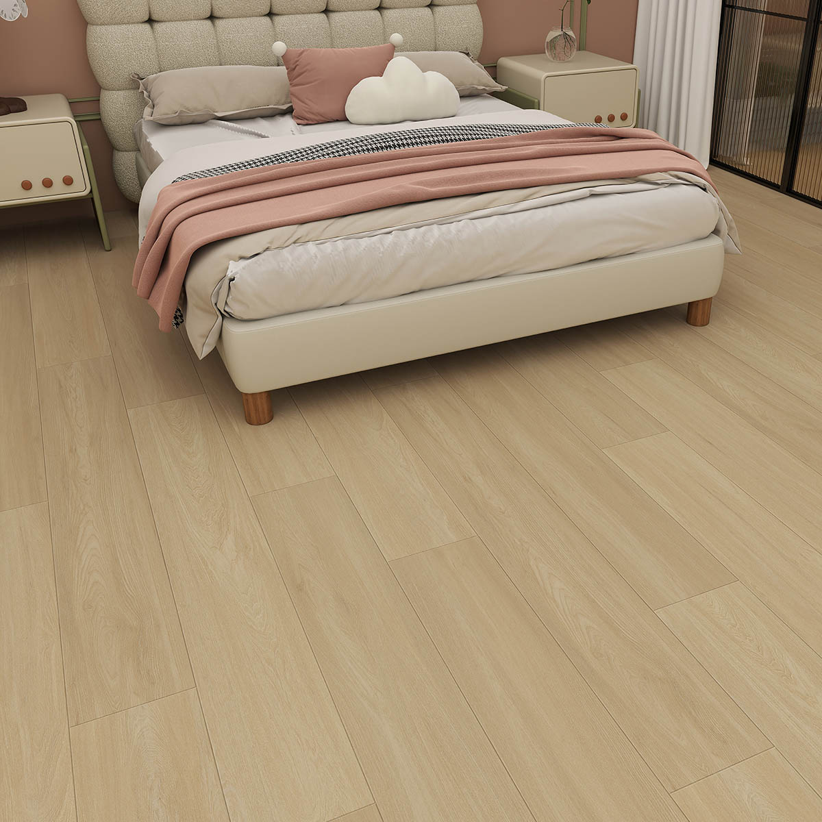 De vloer wordt verlijmd geplaatst en heeft een Embossed in Register structuur met een micro 4V groef rondom de plank. Hierdoor blijft het houtdecor duidelijk zichtbaar en ontstaat een realistisch oppervlak.