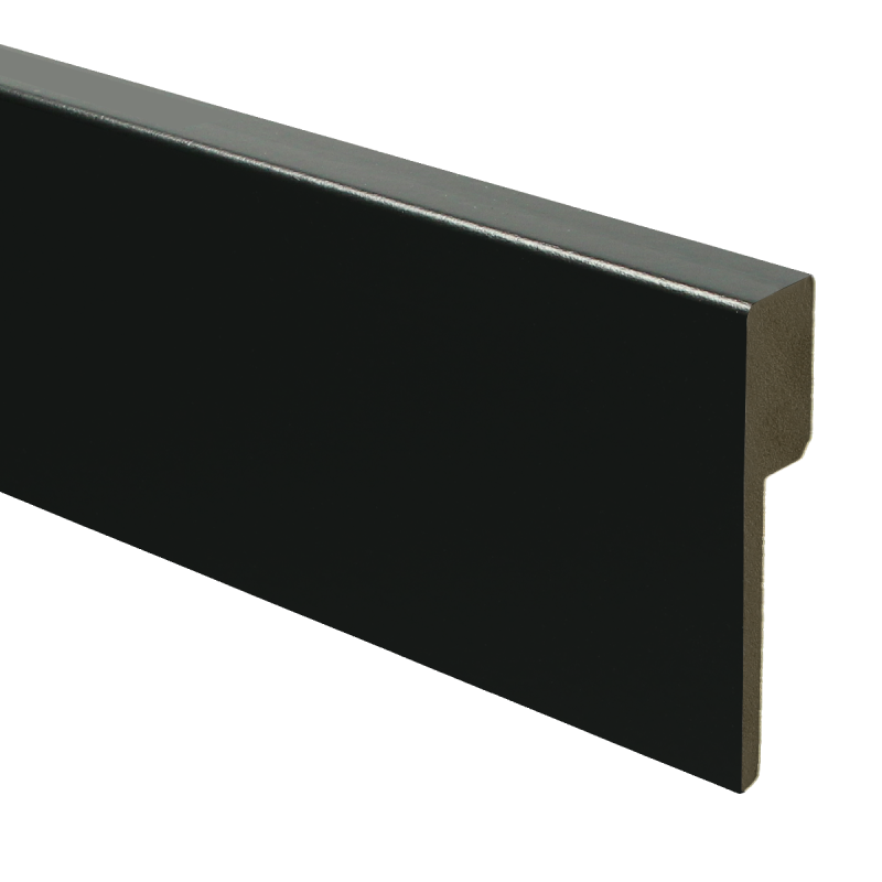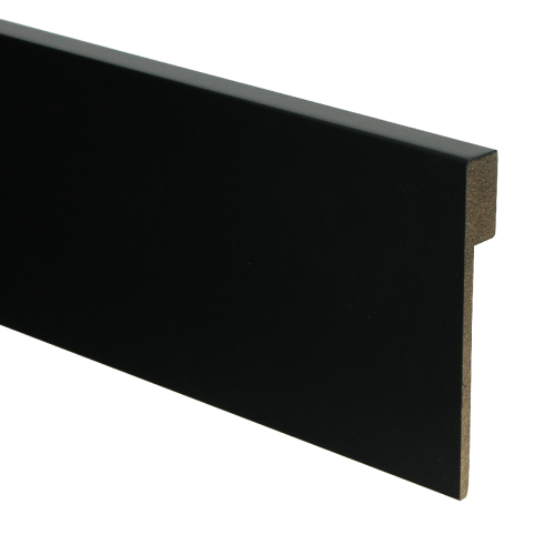 De zwarte renovatieplint is gemaakt van vochtwerend MDF (V313-kwaliteit), wat deze overzetplint geschikt maakt voor uiteenlopende ruimtes. Of het nu gaat om een woonkamer, hal, slaapkamer of licht vochtige ruimte: deze voorgelakte plint in zwart RAL 9005 sluit moeiteloos aan bij donkere vloeren, zwarte kozijnen en moderne interieurontwerpen. Door de diepe zwarte kleur zorgt deze plint voor contrast en een rustige lijn langs de wand.